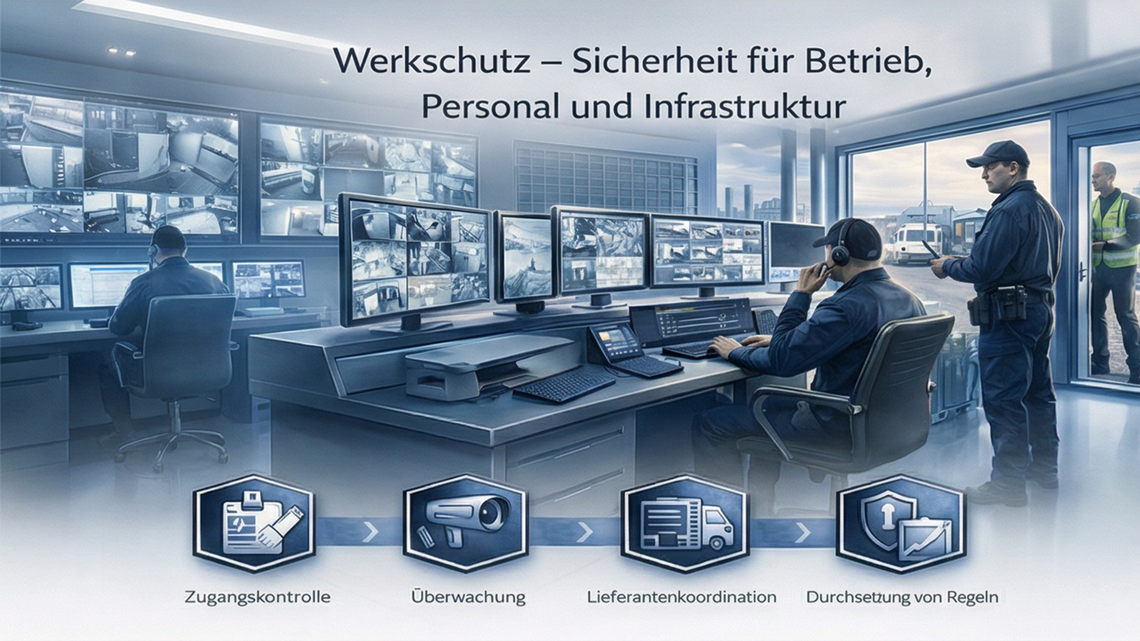 Ein wichtiger Bestandteil professioneller Sicherheitsstrukturen ist die zuverlässige Besetzung von Sicherheitszentralen. Wir stellen qualifizierte Mitarbeiter*innen für Sicherheitszentralen bereit, die Informationen effizient aufnehmen, Ereignisse dokumentieren und rasch reagieren können.
